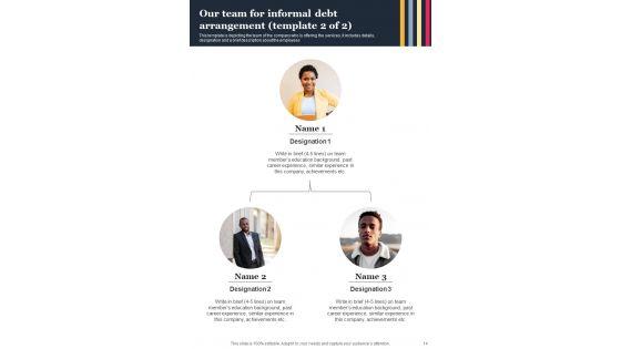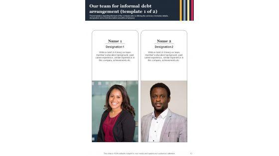 Presenting you an exemplary Our Team For Informal Debt Arrangement One Pager Sample Example Document. Our one-pager comprises all the must-have essentials of an inclusive document. You can edit it with ease, as its layout is completely editable. With such freedom, you can tweak its design and other elements to your requirements. Download this Our Team For Informal Debt Arrangement One Pager Sample Example Document brilliant piece now. Our Our Team For Informal Debt Arrangement One Pager Sample Example Document are topically designed to provide an attractive backdrop to any subject. Use them to look like a presentation pro.