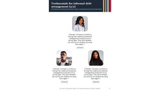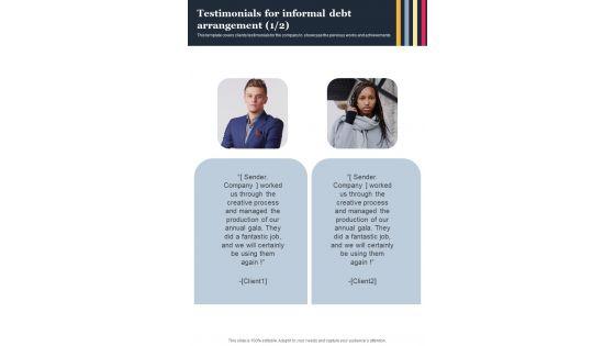 Presenting you an exemplary Testimonials For Informal Debt Arrangement One Pager Sample Example Document. Our one-pager comprises all the must-have essentials of an inclusive document. You can edit it with ease, as its layout is completely editable. With such freedom, you can tweak its design and other elements to your requirements. Download this Testimonials For Informal Debt Arrangement One Pager Sample Example Document brilliant piece now. Our Testimonials For Informal Debt Arrangement One Pager Sample Example Document are topically designed to provide an attractive backdrop to any subject. Use them to look like a presentation pro.