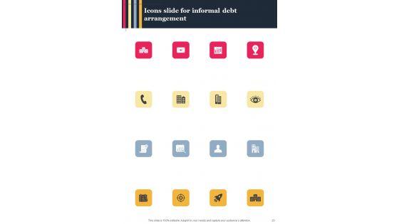Presenting you an exemplary Icons Slide For Informal Debt Arrangement One Pager Sample Example Document. Our one-pager comprises all the must-have essentials of an inclusive document. You can edit it with ease, as its layout is completely editable. With such freedom, you can tweak its design and other elements to your requirements. Download this Icons Slide For Informal Debt Arrangement One Pager Sample Example Document brilliant piece now. Our Icons Slide For Informal Debt Arrangement One Pager Sample Example Document are topically designed to provide an attractive backdrop to any subject. Use them to look like a presentation pro.