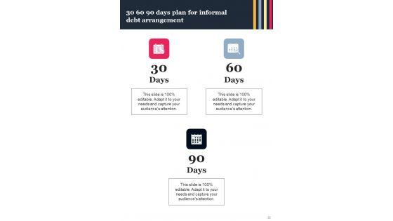 Presenting you an exemplary 30 60 90 Days Plan For Informal Debt Arrangement One Pager Sample Example Document. Our one-pager comprises all the must-have essentials of an inclusive document. You can edit it with ease, as its layout is completely editable. With such freedom, you can tweak its design and other elements to your requirements. Download this 30 60 90 Days Plan For Informal Debt Arrangement One Pager Sample Example Document brilliant piece now. Our 30 60 90 Days Plan For Informal Debt Arrangement One Pager Sample Example Document are topically designed to provide an attractive backdrop to any subject. Use them to look like a presentation pro.