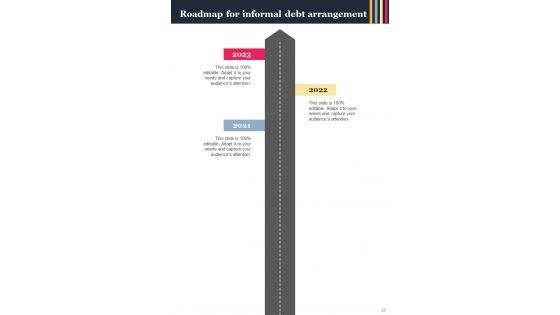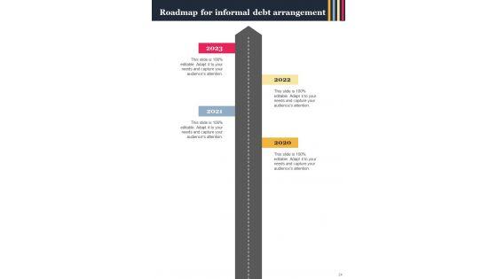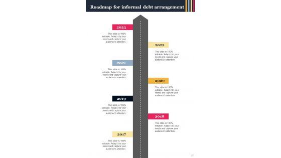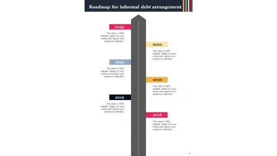Presenting you an exemplary Roadmap For Informal Debt Arrangement One Pager Sample Example Document. Our one-pager comprises all the must-have essentials of an inclusive document. You can edit it with ease, as its layout is completely editable. With such freedom, you can tweak its design and other elements to your requirements. Download this Roadmap For Informal Debt Arrangement One Pager Sample Example Document brilliant piece now. Our Roadmap For Informal Debt Arrangement One Pager Sample Example Document are topically designed to provide an attractive backdrop to any subject. Use them to look like a presentation pro.