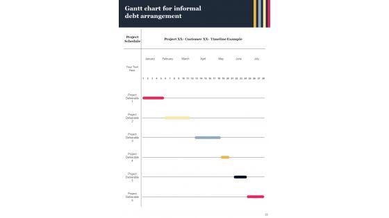 Presenting you an exemplary Gantt Chart For Informal Debt Arrangement One Pager Sample Example Document. Our one-pager comprises all the must-have essentials of an inclusive document. You can edit it with ease, as its layout is completely editable. With such freedom, you can tweak its design and other elements to your requirements. Download this Gantt Chart For Informal Debt Arrangement One Pager Sample Example Document brilliant piece now. Our Gantt Chart For Informal Debt Arrangement One Pager Sample Example Document are topically designed to provide an attractive backdrop to any subject. Use them to look like a presentation pro.