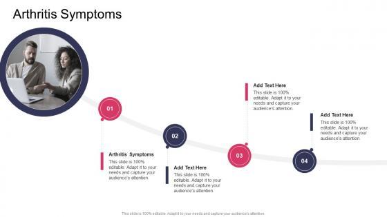 Introducing our well-designed Arthritis Symptoms In Powerpoint And Google Slides Cpb. This PowerPoint design presents information on topics like Arthritis Symptoms. As it is predesigned it helps boost your confidence level. It also makes you a better presenter because of its high-quality content and graphics. This PPT layout can be downloaded and used in different formats like PDF, PNG, and JPG. Not only this, it is available in both Standard Screen and Widescreen aspect ratios for your convenience. Therefore, click on the download button now to persuade and impress your audience. Our Arthritis Symptoms In Powerpoint And Google Slides Cpb are topically designed to provide an attractive backdrop to any subject. Use them to look like a presentation pro.