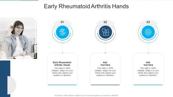 Introducing our well designed Early Rheumatoid Arthritis Hands In Powerpoint And Google Slides Cpb This PowerPoint design presents information on topics like Early Rheumatoid Arthritis Hands As it is predesigned it helps boost your confidence level. It also makes you a better presenter because of its high quality content and graphics. This PPT layout can be downloaded and used in different formats like PDF, PNG, and JPG. Not only this, it is available in both Standard Screen and Widescreen aspect ratios for your convenience. Therefore, click on the download button now to persuade and impress your audience. Our Early Rheumatoid Arthritis Hands In Powerpoint And Google Slides Cpb are topically designed to provide an attractive backdrop to any subject. Use them to look like a presentation pro.
