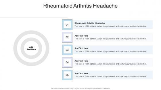 Introducing our well designed Rheumatoid Arthritis Headache In Powerpoint And Google Slides Cpb. This PowerPoint design presents information on topics like Rheumatoid Arthritis Headache. As it is predesigned it helps boost your confidence level. It also makes you a better presenter because of its high-quality content and graphics. This PPT layout can be downloaded and used in different formats like PDF, PNG, and JPG. Not only this, it is available in both Standard Screen and Widescreen aspect ratios for your convenience. Therefore, click on the download button now to persuade and impress your audience. Our Rheumatoid Arthritis Headache In Powerpoint And Google Slides Cpb are topically designed to provide an attractive backdrop to any subject. Use them to look like a presentation pro.