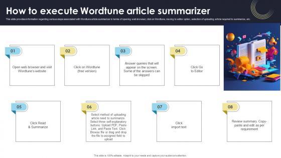 This slide provides information regarding various steps associated with Wordtune article summarizer in terms of opening web browser, click on Wordtune, moving to editor option, selection of uploading article required to summarize, etc. Create an editable How To Execute Wordtune Article Summarizer How Generative AI Tools Work AI SS V that communicates your idea and engages your audience. Whether you are presenting a business or an educational presentation, pre-designed presentation templates help save time. How To Execute Wordtune Article Summarizer How Generative AI Tools Work AI SS V is highly customizable and very easy to edit, covering many different styles from creative to business presentations. Slidegeeks has creative team members who have crafted amazing templates. So, go and get them without any delay. This slide provides information regarding various steps associated with Wordtune article summarizer in terms of opening web browser, click on Wordtune, moving to editor option, selection of uploading article required to summarize, etc.