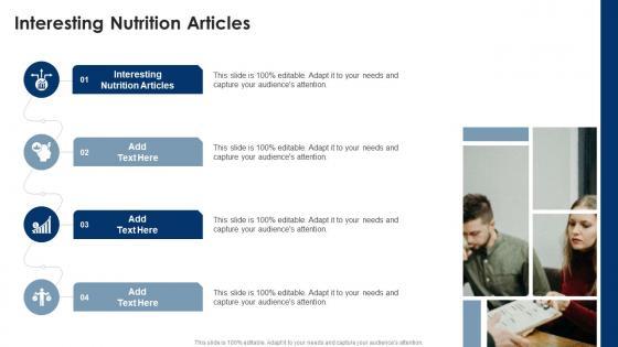 Presenting our innovatively designed set of slides titled Interesting Nutrition Articles In Powerpoint And Google Slides Cpb. This completely editable PowerPoint graphic exhibits Interesting Nutrition Articles that will help you convey the message impactfully. It can be accessed with Google Slides and is available in both standard screen and widescreen aspect ratios. Apart from this, you can download this well structured PowerPoint template design in different formats like PDF, JPG, and PNG. So, click the download button now to gain full access to this PPT design. Our Interesting Nutrition Articles In Powerpoint And Google Slides Cpb are topically designed to provide an attractive backdrop to any subject. Use them to look like a presentation pro.