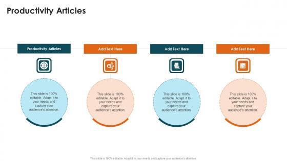 Introducing our well designed Productivity Articles In Powerpoint And Google Slides Cpb This PowerPoint design presents information on topics like Productivity Articles As it is predesigned it helps boost your confidence level. It also makes you a better presenter because of its high quality content and graphics. This PPT layout can be downloaded and used in different formats like PDF, PNG, and JPG. Not only this, it is available in both Standard Screen and Widescreen aspect ratios for your convenience. Therefore, click on the download button now to persuade and impress your audience. Our Productivity Articles In Powerpoint And Google Slides Cpb are topically designed to provide an attractive backdrop to any subject. Use them to look like a presentation pro.