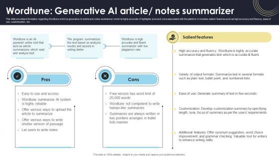 This slide provides information regarding Wordtune which is generative AI article and notes summarizer which is highly accurate. It highlights pros and cons associated with the platform. It includes salient features such as high accuracy and fluency, ease of use, customization, etc. Here you can discover an assortment of the finest PowerPoint and Google Slides templates. With these templates, you can create presentations for a variety of purposes while simultaneously providing your audience with an eye-catching visual experience. Download Wordtune Generative AI Article Notes Summarizer How Generative AI Tools Work AI SS V to deliver an impeccable presentation. These templates will make your job of preparing presentations much quicker, yet still, maintain a high level of quality. Slidegeeks has experienced researchers who prepare these templates and write high-quality content for you. Later on, you can personalize the content by editing the Wordtune Generative AI Article Notes Summarizer How Generative AI Tools Work AI SS V. This slide provides information regarding Wordtune which is generative AI article and notes summarizer which is highly accurate. It highlights pros and cons associated with the platform. It includes salient features such as high accuracy and fluency, ease of use, customization, etc.