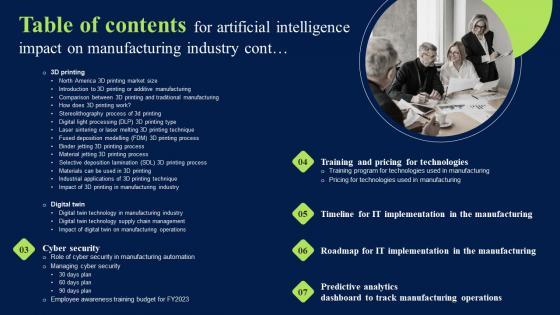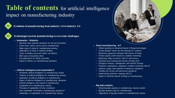 Are you in need of a template that can accommodate all of your creative concepts This one is crafted professionally and can be altered to fit any style. Use it with Google Slides or PowerPoint. Include striking photographs, symbols, depictions, and other visuals. Fill, move around, or remove text boxes as desired. Test out color palettes and font mixtures. Edit and save your work, or work with colleagues. Download Table Of Contents For Artificial Intelligence Impact On Manufacturing Industry Elements PDF and observe how to make your presentation outstanding. Give an impeccable presentation to your group and make your presentation unforgettable. Our Table Of Contents For Artificial Intelligence Impact On Manufacturing Industry Elements PDF are topically designed to provide an attractive backdrop to any subject. Use them to look like a presentation pro.