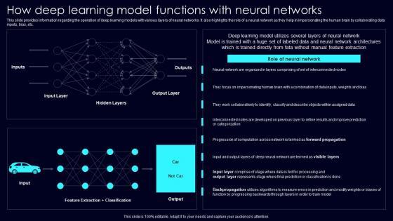 This slide provides information regarding the operation of deep learning models with various layers of neural networks. It also highlights the role of a neural network as they help in impersonating the human brain by collaborating data inputs, bias, etc. Boost your pitch with our creative How Deep Learning Model Exploring Rise Of Generative AI In Artificial Intelligence Introduction Pdf. Deliver an awe inspiring pitch that will mesmerize everyone. Using these presentation templates you will surely catch everyones attention. You can browse the ppts collection on our website. We have researchers who are experts at creating the right content for the templates. So you do not have to invest time in any additional work. Just grab the template now and use them. This slide provides information regarding the operation of deep learning models with various layers of neural networks. It also highlights the role of a neural network as they help in impersonating the human brain by collaborating data inputs, bias, etc.