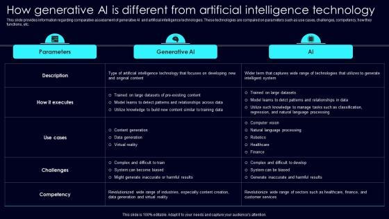 This slide provides information regarding comparative assessment of generative AI and artificial intelligence technologies. These technologies are compared on parameters such as use cases, challenges, competency, how they functions, etc. Create an editable How Generative AI Is Different Exploring Rise Of Generative AI In Artificial Intelligence Infographics Pdf that communicates your idea and engages your audience. Whether you are presenting a business or an educational presentation, pre designed presentation templates help save time. How Generative AI Is Different Exploring Rise Of Generative AI In Artificial Intelligence Infographics Pdf is highly customizable and very easy to edit, covering many different styles from creative to business presentations. Slidegeeks has creative team members who have crafted amazing templates. So, go and get them without any delay. This slide provides information regarding comparative assessment of generative AI and artificial intelligence technologies. These technologies are compared on parameters such as use cases, challenges, competency, how they functions, etc.