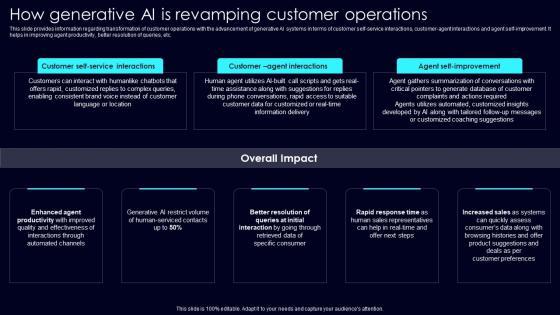 This slide provides information regarding transformation of customer operations with the advancement of generative AI systems in terms of customer self service interactions, customer agent interactions and agent self improvement. It helps in improving agent productivity, better resolution of queries, etc. Slidegeeks is one of the best resources for PowerPoint templates. You can download easily and regulate How Generative AI Is Exploring Rise Of Generative AI In Artificial Intelligence Summary Pdf for your personal presentations from our wonderful collection. A few clicks is all it takes to discover and get the most relevant and appropriate templates. Use our Templates to add a unique zing and appeal to your presentation and meetings. All the slides are easy to edit and you can use them even for advertisement purposes. This slide provides information regarding transformation of customer operations with the advancement of generative AI systems in terms of customer self service interactions, customer agent interactions and agent self improvement. It helps in improving agent productivity, better resolution of queries, etc.
