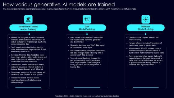 This slide provides information regarding training procedure of various types of generative AI models such as transformer based model training, GAN model training and diffusion model. Want to ace your presentation in front of a live audience Our How Various Generative Exploring Rise Of Generative AI In Artificial Intelligence Background Pdf can help you do that by engaging all the users towards you. Slidegeeks experts have put their efforts and expertise into creating these impeccable powerpoint presentations so that you can communicate your ideas clearly. Moreover, all the templates are customizable, and easy to edit and downloadable. Use these for both personal and commercial use. This slide provides information regarding training procedure of various types of generative AI models such as transformer based model training, GAN model training and diffusion model.