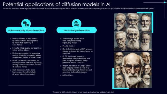This slide provides information regarding various use cases of diffusion models integrated in AI. It assists in delivering optimum quality video generation and photorealistic images from textual content input to the system. From laying roadmaps to briefing everything in detail, our templates are perfect for you. You can set the stage with your presentation slides. All you have to do is download these easy to edit and customizable templates. Potential Applications Of Diffusion Exploring Rise Of Generative AI In Artificial Intelligence Sample Pdf will help you deliver an outstanding performance that everyone would remember and praise you for. Do download this presentation today. This slide provides information regarding various use cases of diffusion models integrated in AI. It assists in delivering optimum quality video generation and photorealistic images from textual content input to the system.