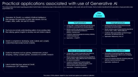 This slide provides information regarding generative AI which helps in developing range of data variants in terms of images, video, audio, text and 3D models. Such a model is beneficial for text generation, image generation, data augmentation, etc. Present like a pro with Practical Applications Associated Exploring Rise Of Generative AI In Artificial Intelligence Portrait Pdf Create beautiful presentations together with your team, using our easy to use presentation slides. Share your ideas in real time and make changes on the fly by downloading our templates. So whether you are in the office, on the go, or in a remote location, you can stay in sync with your team and present your ideas with confidence. With Slidegeeks presentation got a whole lot easier. Grab these presentations today. This slide provides information regarding generative AI which helps in developing range of data variants in terms of images, video, audio, text and 3D models. Such a model is beneficial for text generation, image generation, data augmentation, etc.