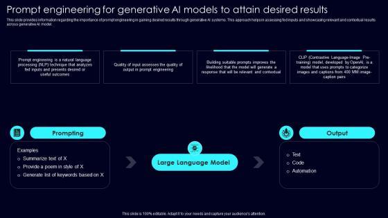 This slide provides information regarding the importance of prompt engineering in gaining desired results through generative AI systems. This approach helps in assessing fed inputs and showcasing relevant and contextual results across generative AI model. Whether you have daily or monthly meetings, a brilliant presentation is necessary. Prompt Engineering For Generative Exploring Rise Of Generative AI In Artificial Intelligence Portrait Pdf can be your best option for delivering a presentation. Represent everything in detail using Prompt Engineering For Generative Exploring Rise Of Generative AI In Artificial Intelligence Portrait Pdf and make yourself stand out in meetings. The template is versatile and follows a structure that will cater to your requirements. All the templates prepared by Slidegeeks are easy to download and edit. Our research experts have taken care of the corporate themes as well. So, give it a try and see the results. This slide provides information regarding the importance of prompt engineering in gaining desired results through generative AI systems. This approach helps in assessing fed inputs and showcasing relevant and contextual results across generative AI model.
