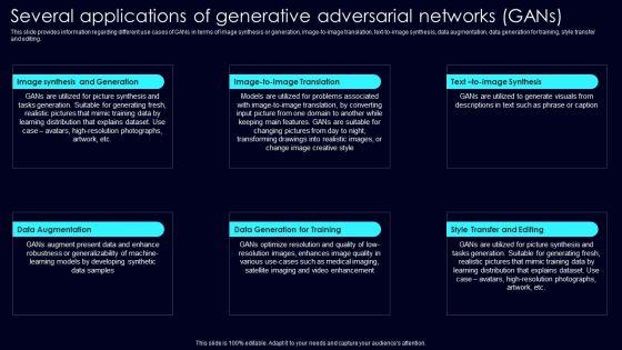 This slide provides information regarding different use cases of GANs in terms of image synthesis or generation, image to image translation, text to image synthesis, data augmentation, data generation for training, style transfer and editing. Crafting an eye catching presentation has never been more straightforward. Let your presentation shine with this tasteful yet straightforward Several Applications Of Generative Exploring Rise Of Generative AI In Artificial Intelligence Graphics Pdf template. It offers a minimalistic and classy look that is great for making a statement. The colors have been employed intelligently to add a bit of playfulness while still remaining professional. Construct the ideal Several Applications Of Generative Exploring Rise Of Generative AI In Artificial Intelligence Graphics Pdf that effortlessly grabs the attention of your audience Begin now and be certain to wow your customers This slide provides information regarding different use cases of GANs in terms of image synthesis or generation, image to image translation, text to image synthesis, data augmentation, data generation for training, style transfer and editing.