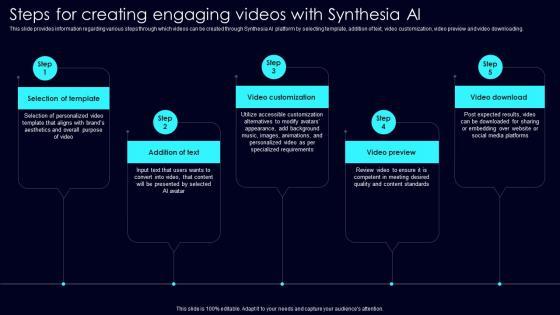This slide provides information regarding various steps through which videos can be created through Synthesia AI platform by selecting template, addition of text, video customization, video preview and video downloading. Formulating a presentation can take up a lot of effort and time, so the content and message should always be the primary focus. The visuals of the PowerPoint can enhance the presenters message, so our Steps For Creating Engaging Exploring Rise Of Generative AI In Artificial Intelligence Graphics Pdf was created to help save time. Instead of worrying about the design, the presenter can concentrate on the message while our designers work on creating the ideal templates for whatever situation is needed. Slidegeeks has experts for everything from amazing designs to valuable content, we have put everything into Steps For Creating Engaging Exploring Rise Of Generative AI In Artificial Intelligence Graphics Pdf This slide provides information regarding various steps through which videos can be created through Synthesia AI platform by selecting template, addition of text, video customization, video preview and video downloading.