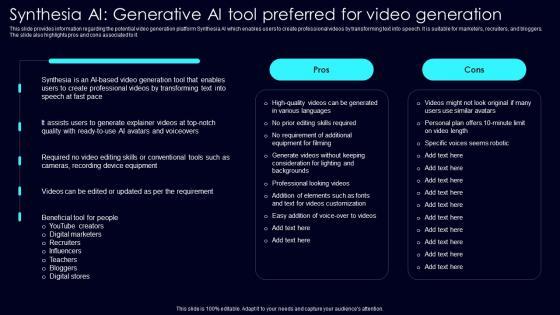 This slide provides information regarding the potential video generation platform Synthesia AI which enables users to create professional videos by transforming text into speech. It is suitable for marketers, recruiters, and bloggers. The slide also highlights pros and cons associated to it. This Synthesia AI Generative AI Exploring Rise Of Generative AI In Artificial Intelligence Sample Pdf is perfect for any presentation, be it in front of clients or colleagues. It is a versatile and stylish solution for organizing your meetings. The Synthesia AI Generative AI Exploring Rise Of Generative AI In Artificial Intelligence Sample Pdf features a modern design for your presentation meetings. The adjustable and customizable slides provide unlimited possibilities for acing up your presentation. Slidegeeks has done all the homework before launching the product for you. So, do not wait, grab the presentation templates today This slide provides information regarding the potential video generation platform Synthesia AI which enables users to create professional videos by transforming text into speech. It is suitable for marketers, recruiters, and bloggers. The slide also highlights pros and cons associated to it.