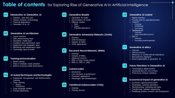 Welcome to our selection of the Table Of Contents For Exploring Rise Of Generative AI In Artificial Intelligence Formats Pdf. These are designed to help you showcase your creativity and bring your sphere to life. Planning and Innovation are essential for any business that is just starting out. This collection contains the designs that you need for your everyday presentations. All of our PowerPoints are 100 percent editable, so you can customize them to suit your needs. This multi purpose template can be used in various situations. Grab these presentation templates today Our Table Of Contents For Exploring Rise Of Generative AI In Artificial Intelligence Formats Pdf are topically designed to provide an attractive backdrop to any subject. Use them to look like a presentation pro.