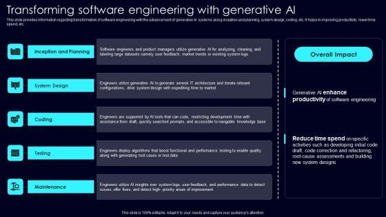 This slide provides information regarding transformation of software engineering with the advancement of generative AI systems along inception and planning, system design, coding, etc. It helps in improving productivity, lower time spend, etc. The best PPT templates are a great way to save time, energy, and resources. Slidegeeks have 100 percent editable powerpoint slides making them incredibly versatile. With these quality presentation templates, you can create a captivating and memorable presentation by combining visually appealing slides and effectively communicating your message. Download Transforming Software Engineering Exploring Rise Of Generative AI In Artificial Intelligence Designs Pdf from Slidegeeks and deliver a wonderful presentation. This slide provides information regarding transformation of software engineering with the advancement of generative AI systems along inception and planning, system design, coding, etc. It helps in improving productivity, lower time spend, etc.