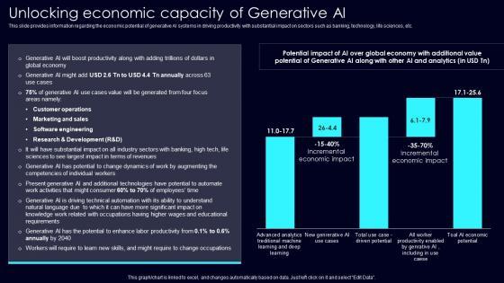 This slide provides information regarding the economic potential of generative AI systems in driving productivity with substantial impact on sectors such as banking, technology, life sciences, etc. Presenting this PowerPoint presentation, titled Unlocking Economic Capacity Exploring Rise Of Generative AI In Artificial Intelligence Elements Pdf, with topics curated by our researchers after extensive research. This editable presentation is available for immediate download and provides attractive features when used. Download now and captivate your audience. Presenting this Unlocking Economic Capacity Exploring Rise Of Generative AI In Artificial Intelligence Elements Pdf. Our researchers have carefully researched and created these slides with all aspects taken into consideration. This is a completely customizable Unlocking Economic Capacity Exploring Rise Of Generative AI In Artificial Intelligence Elements Pdf that is available for immediate downloading. Download now and make an impact on your audience. Highlight the attractive features available with our PPTs. This slide provides information regarding the economic potential of generative AI systems in driving productivity with substantial impact on sectors such as banking, technology, life sciences, etc.