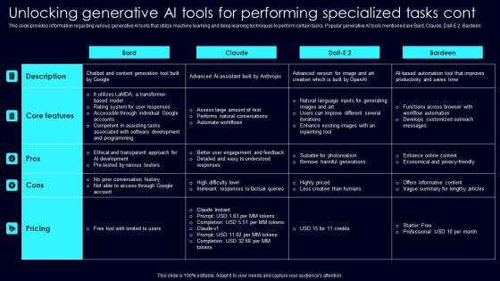 This slide provides information regarding various generative AI tools that utilize machine learning and deep learning techniques to perform certain tasks. Popular generative AI tools mentioned are GPT 4, ChatGPT, AlphaCode, GitHub Copilot. Here you can discover an assortment of the finest PowerPoint and Google Slides templates. With these templates, you can create presentations for a variety of purposes while simultaneously providing your audience with an eye catching visual experience. Download Unlocking Generative AI Tools Exploring Rise Of Generative AI In Artificial Intelligence Structure Pdf to deliver an impeccable presentation. These templates will make your job of preparing presentations much quicker, yet still, maintain a high level of quality. Slidegeeks has experienced researchers who prepare these templates and write high quality content for you. Later on, you can personalize the content by editing the Unlocking Generative AI Tools Exploring Rise Of Generative AI In Artificial Intelligence Structure Pdf. This slide provides information regarding various generative AI tools that utilize machine learning and deep learning techniques to perform certain tasks. Popular generative AI tools mentioned are GPT 4, ChatGPT, AlphaCode, GitHub Copilot.