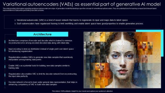 This slide provides information regarding variational autoencoders are a type of generative model that develops upon the concept of conventional autoencoders. They are potential tools for learning compact and relevant latent representations of data while generating new data samples. This Variational Autoencoders Vaes Exploring Rise Of Generative AI In Artificial Intelligence Mockup Pdf from Slidegeeks makes it easy to present information on your topic with precision. It provides customization options, so you can make changes to the colors, design, graphics, or any other component to create a unique layout. It is also available for immediate download, so you can begin using it right away. Slidegeeks has done good research to ensure that you have everything you need to make your presentation stand out. Make a name out there for a brilliant performance. This slide provides information regarding variational autoencoders are a type of generative model that develops upon the concept of conventional autoencoders. They are potential tools for learning compact and relevant latent representations of data while generating new data samples.