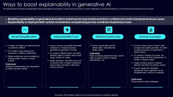 This slide provides information regarding different way explainability in generative AI systems can be improved by model simplification, use of interpretability tools, use if referenceable data and human oversight. Take your projects to the next level with our ultimate collection of Ways To Boost Explainability Exploring Rise Of Generative AI In Artificial Intelligence Topics Pdf. Slidegeeks has designed a range of layouts that are perfect for representing task or activity duration, keeping track of all your deadlines at a glance. Tailor these designs to your exact needs and give them a truly corporate look with your own brand colors they will make your projects stand out from the rest This slide provides information regarding different way explainability in generative AI systems can be improved by model simplification, use of interpretability tools, use if referenceable data and human oversight.