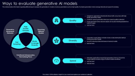 This slide provides information regarding different ways to analyze the generative AI models on various parameters such as high quality of samples generated, mode coverage diversity and speed of sampling. Do you know about Slidesgeeks Ways To Evaluate Generative Exploring Rise Of Generative AI In Artificial Intelligence Portrait Pdf These are perfect for delivering any kind od presentation. Using it, create PowerPoint presentations that communicate your ideas and engage audiences. Save time and effort by using our pre designed presentation templates that are perfect for a wide range of topic. Our vast selection of designs covers a range of styles, from creative to business, and are all highly customizable and easy to edit. Download as a PowerPoint template or use them as Google Slides themes. This slide provides information regarding different ways to analyze the generative AI models on various parameters such as high quality of samples generated, mode coverage diversity and speed of sampling.