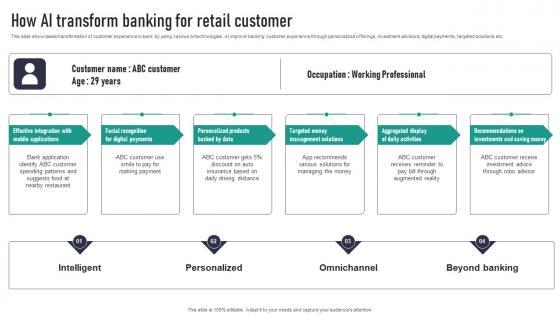 This slide showcases transformation of customer experience in bank by using various AI technologies. AI improve banking customer experience through personalized offerings, investment advisors, digital payments, targeted solutions etc. This How AI Transform Banking For Retail Customer Pictures Pdf from Slidegeeks makes it easy to present information on your topic with precision. It provides customization options, so you can make changes to the colors, design, graphics, or any other component to create a unique layout. It is also available for immediate download, so you can begin using it right away. Slidegeeks has done good research to ensure that you have everything you need to make your presentation stand out. Make a name out there for a brilliant performance. This slide showcases transformation of customer experience in bank by using various AI technologies. AI improve banking customer experience through personalized offerings, investment advisors, digital payments, targeted solutions etc.