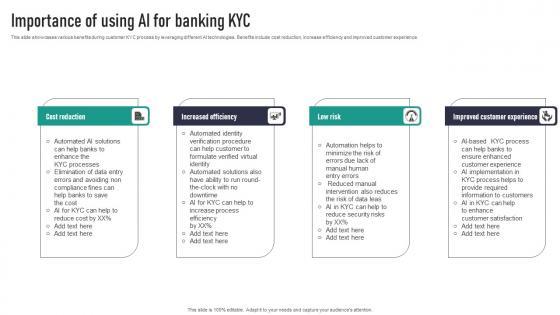 This slide showcases various benefits during customer KYC process by leveraging different AI technologies. Benefits include cost reduction, increase efficiency and improved customer experience. Create an editable Importance Of Using AI For Banking KYC Graphics Pdf that communicates your idea and engages your audience. Whether you are presenting a business or an educational presentation, pre-designed presentation templates help save time. Importance Of Using AI For Banking KYC Graphics Pdf is highly customizable and very easy to edit, covering many different styles from creative to business presentations. Slidegeeks has creative team members who have crafted amazing templates. So, go and get them without any delay. This slide showcases various benefits during customer KYC process by leveraging different AI technologies. Benefits include cost reduction, increase efficiency and improved customer experience.