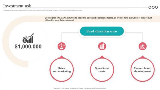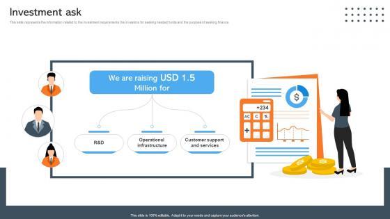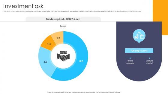 This slide shows information regarding the investment asked by the company from investors. It also includes details about the funding sources which will be considered for raising funds for this round. Whether you have daily or monthly meetings, a brilliant presentation is necessary. Investment Ask Customer Experience Management Company Investor Funding Elevator Pitch Deck can be your best option for delivering a presentation. Represent everything in detail using Investment Ask Customer Experience Management Company Investor Funding Elevator Pitch Deck and make yourself stand out in meetings. The template is versatile and follows a structure that will cater to your requirements. All the templates prepared by Slidegeeks are easy to download and edit. Our research experts have taken care of the corporate themes as well. So, give it a try and see the results. This slide shows information regarding the investment asked by the company from investors. It also includes details about the funding sources which will be considered for raising funds for this round.