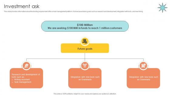 This slide provides information about the funding requirement of the email management platform. It showcases future goals such as research and development, integration with tools, and new hiring. Find highly impressive Investment Ask Email Management Technology Pitch Deck on Slidegeeks to deliver a meaningful presentation. You can save an ample amount of time using these presentation templates. No need to worry to prepare everything from scratch because Slidegeeks experts have already done a huge research and work for you. You need to download Investment Ask Email Management Technology Pitch Deck for your upcoming presentation. All the presentation templates are 100 percent editable and you can change the color and personalize the content accordingly. Download now This slide provides information about the funding requirement of the email management platform. It showcases future goals such as research and development, integration with tools, and new hiring.