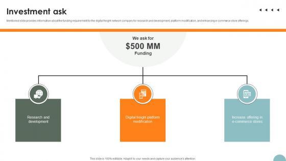 Mentioned slide provides information about the funding requirement for the digital freight network company for research and development, platform modification, and enhancing e-commerce store offerings. Find highly impressive Investment Ask Freight Management Solution Investor Funding Elevator Pitch Deck on Slidegeeks to deliver a meaningful presentation. You can save an ample amount of time using these presentation templates. No need to worry to prepare everything from scratch because Slidegeeks experts have already done a huge research and work for you. You need to download Investment Ask Freight Management Solution Investor Funding Elevator Pitch Deck for your upcoming presentation. All the presentation templates are 100 percent editable and you can change the color and personalize the content accordingly. Download now Mentioned slide provides information about the funding requirement for the digital freight network company for research and development, platform modification, and enhancing e-commerce store offerings.