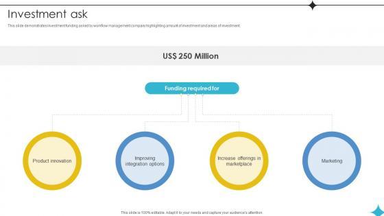 This slide demonstrates investment funding asked by workflow management company highlighting amount of investment and areas of investment. Find highly impressive Investment Ask Workflow Management Investor Funding Elevator Pitch Deck on Slidegeeks to deliver a meaningful presentation. You can save an ample amount of time using these presentation templates. No need to worry to prepare everything from scratch because Slidegeeks experts have already done a huge research and work for you. You need to download Investment Ask Workflow Management Investor Funding Elevator Pitch Deck for your upcoming presentation. All the presentation templates are 100 percent editable and you can change the color and personalize the content accordingly. Download now This slide demonstrates investment funding asked by workflow management company highlighting amount of investment and areas of investment.