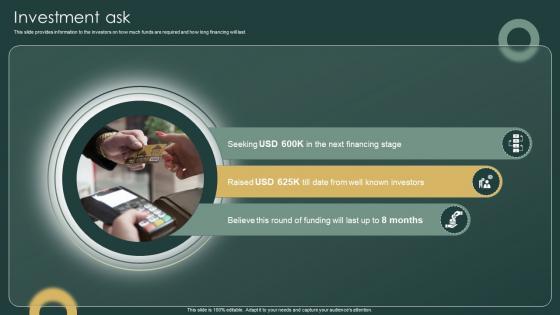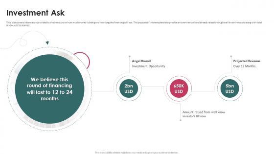 This slide presents details about companys investment ask detailing how much they tend to raise , their goal, how much this financing will last. Find highly impressive Investment Ask Customer Relationship Management Platform Pitch Deck on Slidegeeks to deliver a meaningful presentation. You can save an ample amount of time using these presentation templates. No need to worry to prepare everything from scratch because Slidegeeks experts have already done a huge research and work for you. You need to download Investment Ask Customer Relationship Management Platform Pitch Deck for your upcoming presentation. All the presentation templates are 100 percent editable and you can change the color and personalize the content accordingly. Download now This slide presents details about companys investment ask detailing how much they tend to raise , their goal, how much this financing will last.