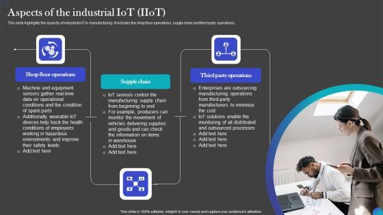 This slide highlights the aspects of industrial IoT in manufacturing. It includes the shop floor operations, supply chain and third party operations. Are you in need of a template that can accommodate all of your creative concepts This one is crafted professionally and can be altered to fit any style. Use it with Google Slides or PowerPoint. Include striking photographs, symbols, depictions, and other visuals. Fill, move around, or remove text boxes as desired. Test out color palettes and font mixtures. Edit and save your work, or work with colleagues. Download Iot Applications For Manufacturing Industry Aspects Of The Industrial Iot IIOT Professional PDF and observe how to make your presentation outstanding. Give an impeccable presentation to your group and make your presentation unforgettable.