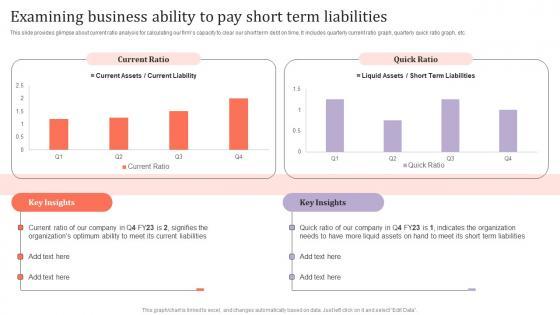 This slide provides glimpse about current ratio analysis for calculating our firms capacity to clear our short term debt on time. It includes quarterly current ratio graph, quarterly quick ratio graph, etc. This Examining Business Ability Pay Short Assessing Corporate Financial Techniques Diagrams Pdf is perfect for any presentation, be it in front of clients or colleagues. It is a versatile and stylish solution for organizing your meetings. The Examining Business Ability Pay Short Assessing Corporate Financial Techniques Diagrams Pdf features a modern design for your presentation meetings. The adjustable and customizable slides provide unlimited possibilities for acing up your presentation. Slidegeeks has done all the homework before launching the product for you. So, do not wait, grab the presentation templates today This slide provides glimpse about current ratio analysis for calculating our firms capacity to clear our short term debt on time. It includes quarterly current ratio graph, quarterly quick ratio graph, etc.
