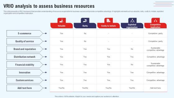 This slide presents a VRIO framework that provides understanding of resources responsible for business success and provide competitive advantage. It highlights element such as valuable, rarity, costly to imitate, exploited organization and competitive implication. Slidegeeks is here to make your presentations a breeze with Marketing Mix Strategy Handbook VRIO Analysis To Assess Business Resources Ideas PDF With our easy-to-use and customizable templates, you can focus on delivering your ideas rather than worrying about formatting. With a variety of designs to choose from, you are sure to find one that suits your needs. And with animations and unique photos, illustrations, and fonts, you can make your presentation pop. So whether you are giving a sales pitch or presenting to the board, make sure to check out Slidegeeks first