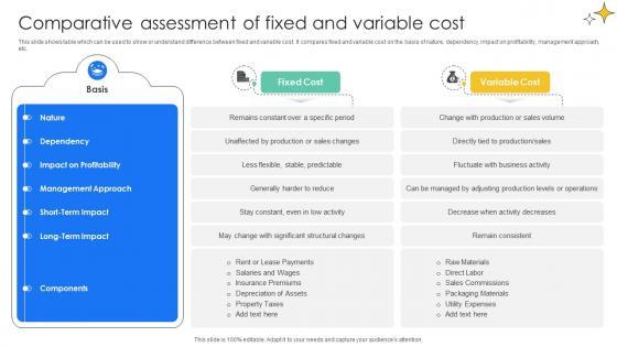 This slide shows table which can be used to show or understand difference between fixed and variable cost. It compares fixed and variable cost on the basis of nature, dependency, impact on profitability, management approach, etc. Present like a pro with Comparative Assessment Of Fixed And Variable Effective And Efficient Tools To Develop Fin SS V. Create beautiful presentations together with your team, using our easy-to-use presentation slides. Share your ideas in real-time and make changes on the fly by downloading our templates. So whether you are in the office, on the go, or in a remote location, you can stay in sync with your team and present your ideas with confidence. With Slidegeeks presentation got a whole lot easier. Grab these presentations today. This slide shows table which can be used to show or understand difference between fixed and variable cost. It compares fixed and variable cost on the basis of nature, dependency, impact on profitability, management approach, etc.