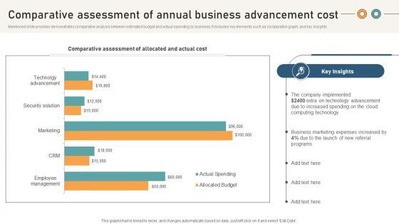 Mentioned slide provides demonstrates comparative analysis between estimated budget and actual spending by business. It includes key elements such as comparative graph, and key insights. If your project calls for a presentation, then Slidegeeks is your go-to partner because we have professionally designed, easy-to-edit templates that are perfect for any presentation. After downloading, you can easily edit Managing Technical And Non Comparative Assessment Of Annual Business Advancement and make the changes accordingly. You can rearrange slides or fill them with different images. Check out all the handy templates Mentioned slide provides demonstrates comparative analysis between estimated budget and actual spending by business. It includes key elements such as comparative graph, and key insights.