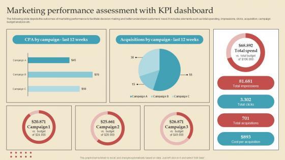 The following slide depicts the outcomes of marketing performance to facilitate decision making and better understand customers need. It includes elements such as total spending, impressions, clicks, acquisition, campaign budget analysis etc. There are so many reasons you need a Marketing Performance Assessment Describing Business Performance Administration Goals Structure Pdf. The first reason is you can not spend time making everything from scratch, Thus, Slidegeeks has made presentation templates for you too. You can easily download these templates from our website easily. The following slide depicts the outcomes of marketing performance to facilitate decision making and better understand customers need. It includes elements such as total spending, impressions, clicks, acquisition, campaign budget analysis etc.