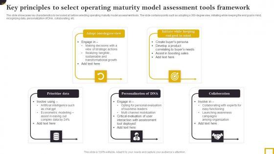 The slide showcases key characteristics to be looked at before selecting operating maturity model assessment tools. The slide contains points such as adopting a 360-degree view, initiating while keeping the end goal in mind, recognizing data, personalization of DNA, collaborating, etc. Pitch your topic with ease and precision using this Key Principles To Select Operating Maturity Model Assessment Tools Framework Diagrams Pdf. This layout presents information on Goal Mind, Recognizing Data, Personalization DNA, Collaborating. It is also available for immediate download and adjustment. So, changes can be made in the color, design, graphics or any other component to create a unique layout. The slide showcases key characteristics to be looked at before selecting operating maturity model assessment tools. The slide contains points such as adopting a 360-degree view, initiating while keeping the end goal in mind, recognizing data, personalization of DNA, collaborating, etc.