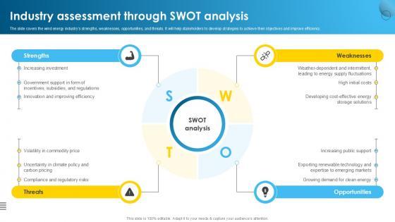 The slide covers the wind energy industrys strengths, weaknesses, opportunities, and threats. It will help stakeholders to develop strategies to achieve their objectives and improve efficiency. If you are looking for a format to display your unique thoughts, then the professionally designed Industry Assessment Through SWOT Global Wind Power Market PPT Slide IR SS V is the one for you. You can use it as a Google Slides template or a PowerPoint template. Incorporate impressive visuals, symbols, images, and other charts. Modify or reorganize the text boxes as you desire. Experiment with shade schemes and font pairings. Alter, share or cooperate with other people on your work. Download Industry Assessment Through SWOT Global Wind Power Market PPT Slide IR SS V and find out how to give a successful presentation. Present a perfect display to your team and make your presentation unforgettable. The slide covers the wind energy industrys strengths, weaknesses, opportunities, and threats. It will help stakeholders to develop strategies to achieve their objectives and improve efficiency.