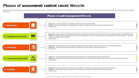 This slide showcases the phases of management lifecycle which helps an organization spend less time on administrative tasks and more time on the audit. It includes details such as organizing, engagement planning, evaluating, tracking, etc. Showcasing this set of slides titled Phases Of Assessment Control Ement Lifecycle Elements Pdf The topics addressed in these templates are Organizing, Engagement Planning, Evaluating All the content presented in this PPT design is completely editable. Download it and make adjustments in color, background, font etc. as per your unique business setting. This slide showcases the phases of management lifecycle which helps an organization spend less time on administrative tasks and more time on the audit. It includes details such as organizing, engagement planning, evaluating, tracking, etc.