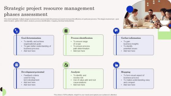 This slide highlights multiple stages involved in the assessment of business process to increase the efficiency of particular process. The stages involved are goal determination, gather information, analysis, process identification, mapping, development potential. Pitch your topic with ease and precision using this Strategic Project Resource Management Phases Assessment Microsoft Pdf. This layout presents information on Goal Determination, Process Identification, Gather Information. It is also available for immediate download and adjustment. So, changes can be made in the color, design, graphics or any other component to create a unique layout. This slide highlights multiple stages involved in the assessment of business process to increase the efficiency of particular process. The stages involved are goal determination, gather information, analysis, process identification, mapping, development potential.