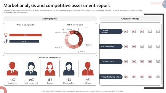 The purpose of this slide is to summarize the results of the market research and competitor analysis survey which was conducted by the marketing manager. The results provided are related to customer demographics and customer ratings. Showcasing this set of slides titled Market Analysis And Competitive Assessment Report Survey SS. The topics addressed in these templates are Product Features, Product Quality, Customer Care, Product Return Policies. All the content presented in this PPT design is completely editable. Download it and make adjustments in color, background, font etc. as per your unique business setting.