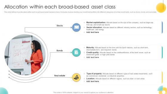This slide defines how allocation within each broad based asset classes is done. It includes involves dividing your investment portfolio into different categories of similar investments, such as stocks, bonds, and real estate.Create an editable Allocation Within Each Broad Based Asset Class Strategic Investment Plan For Optimizing Risk SS V that communicates your idea and engages your audience. Whether you are presenting a business or an educational presentation, pre-designed presentation templates help save time. Allocation Within Each Broad Based Asset Class Strategic Investment Plan For Optimizing Risk SS V is highly customizable and very easy to edit, covering many different styles from creative to business presentations. Slidegeeks has creative team members who have crafted amazing templates. So, go and get them without any delay. This slide defines how allocation within each broad based asset classes is done. It includes involves dividing your investment portfolio into different categories of similar investments, such as stocks, bonds, and real estate.
